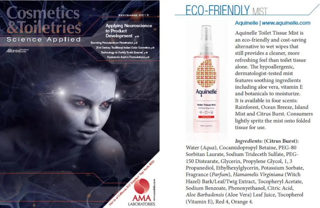 Aquinelle Toilet Tissue Mist was featured in the September 2015 issue of Cosmetics & Toiletries in a product spotlight titled “Eco-Friendly Mist,” highlighting its formula, ingredients, and available fragrances.